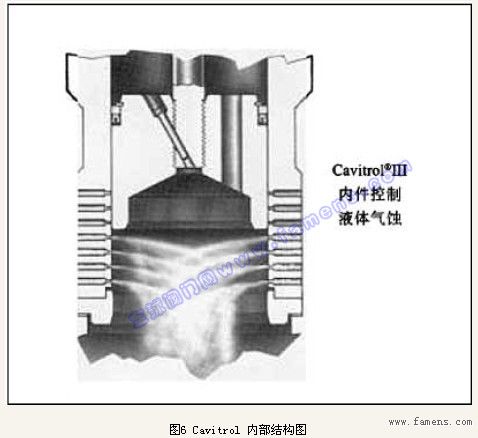 b)選用Fisher公司的Cavitrol Trim III內件,如圖6,它采用二級對液體進行分級降壓,特殊形狀的孔道和鉆孔技術使介質壓力保持在汽化壓力之上防止氣蝕產生;