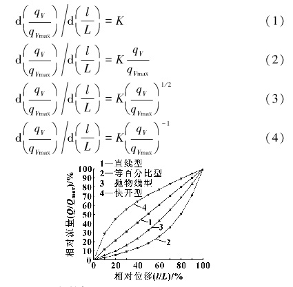 調節閥的流量特性,是指調節閥在某一行程下流量口與全開時的流量口max之比的相對流量(Q/Qmax )與某一行程l與全開行程l的相對開度(l/L)之間的函數關系,表示為Q/Qmax =f (l/L)。相對開度是利用執行器驅動閥桿控制閥瓣與套筒沿套筒軸向的相對位置,改變套筒節流而積大小實現控制閥流量的調節。流量特性的研究是除總體結構、密封和壓力自平衡研究外的一項關鍵。然而在實際工況中,由于多種因素的影響,閥門前后壓降不穩定將導致介質流量不斷變化,為了便于分析,在設計過程中通常設定閥門壓降恒定,再根據實際工況進行修正,兩者分別稱為固有流量特性和工作流量特性圖。其中固有流量特性根據應用場合不同主要分為直線、等百分比(對數)、拋物線及快開特性4種因,如圖1所示,通過相對流量和相對位移之間不同數學表達式(1)一式(4)分別進行計算,其中K是常