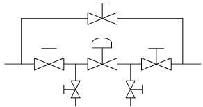 調節閥在使用過程中難免會出現些問題,為能及時處理調節閥故障隱患,在工藝管路上一定要增加旁路閥與前后截止閥,以便能將調節閥從工藝系統中切除處理。而在切斷管路時管內不可避免的積有帶壓流體,因此必須在調節閥前后裝設放泄閥,如圖1。